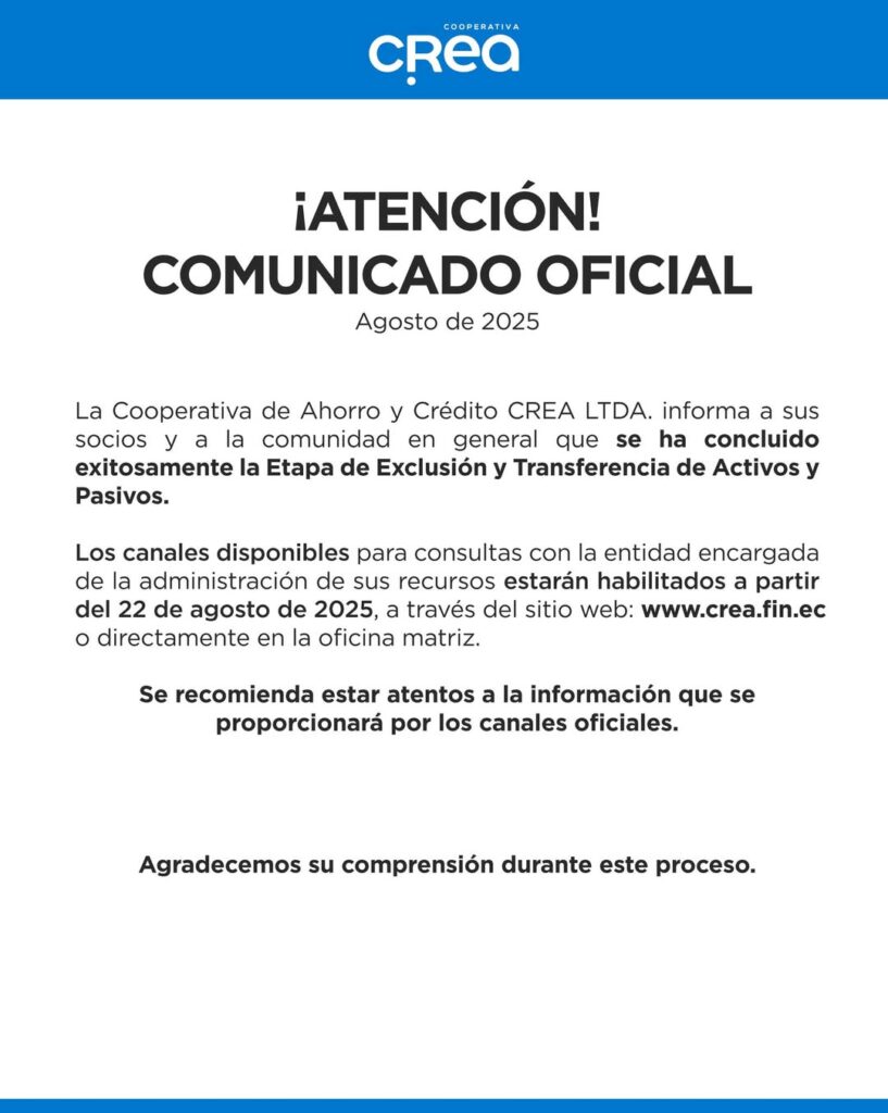 Este jueves 21 de agosto, se dio a conocer que en un proceso conjunto entre la Superintendencia de Economía Popular y Solidaria, se inició el proceso para que las cuentas de ahorro de CREA sean absorbidas por otras cooperativas.