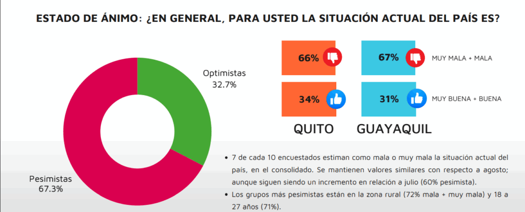 Al proyectar el futuro, el 42% cree que Ecuador seguirá igual en los próximos seis meses, el 34% que estará peor y apenas el 21% que mejorará. En Quito predomina el pesimismo (44% piensa que la situación empeorará), mientras que Guayaquil muestra más optimismo (25% cree que mejorará).