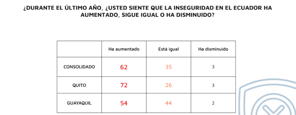 La inseguridad concentra el 68% de las preocupaciones ciudadanas, seguida por la delincuencia organizada y el sicariato. En Quito, los principales problemas mencionados son la inseguridad (30%), los robos (18%) y el desempleo (10%). En Guayaquil destacan la inseguridad (24%), el crimen organizado (20%) y el sicariato (14%).