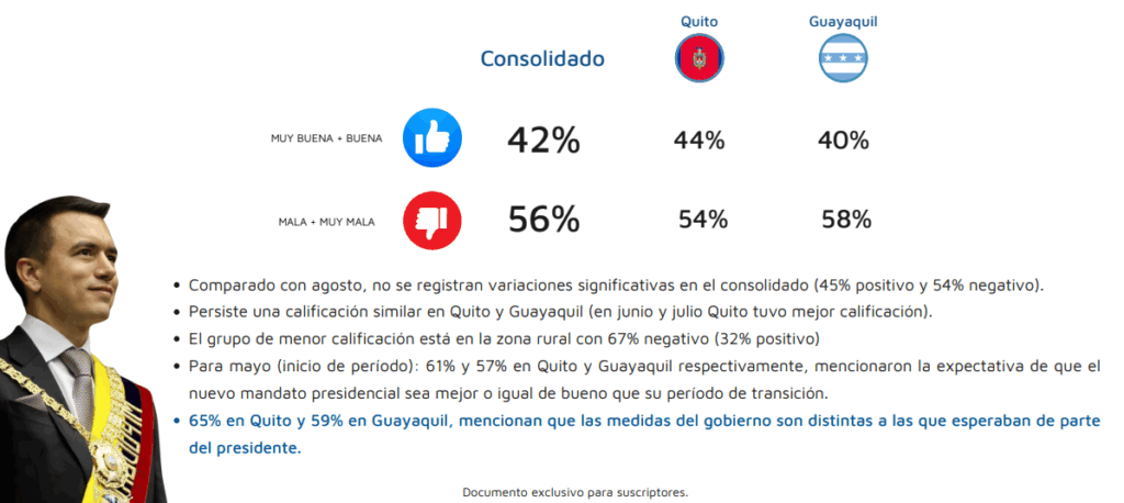 La gestión del presidente Daniel Noboa registra un 54% de calificación negativa frente a un 44% positiva. La percepción negativa es mayor en el sector rural (67%).