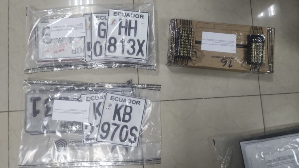 Además, dentro del inmueble encontraron 20 placas vehiculares de motocicletas y autos, documentos con similares características a revisiones vehiculares y matriculación con sellos de cantones como Balzar, Chone, Quito, Bucay, Naranjal, Tosagua y Salitre.