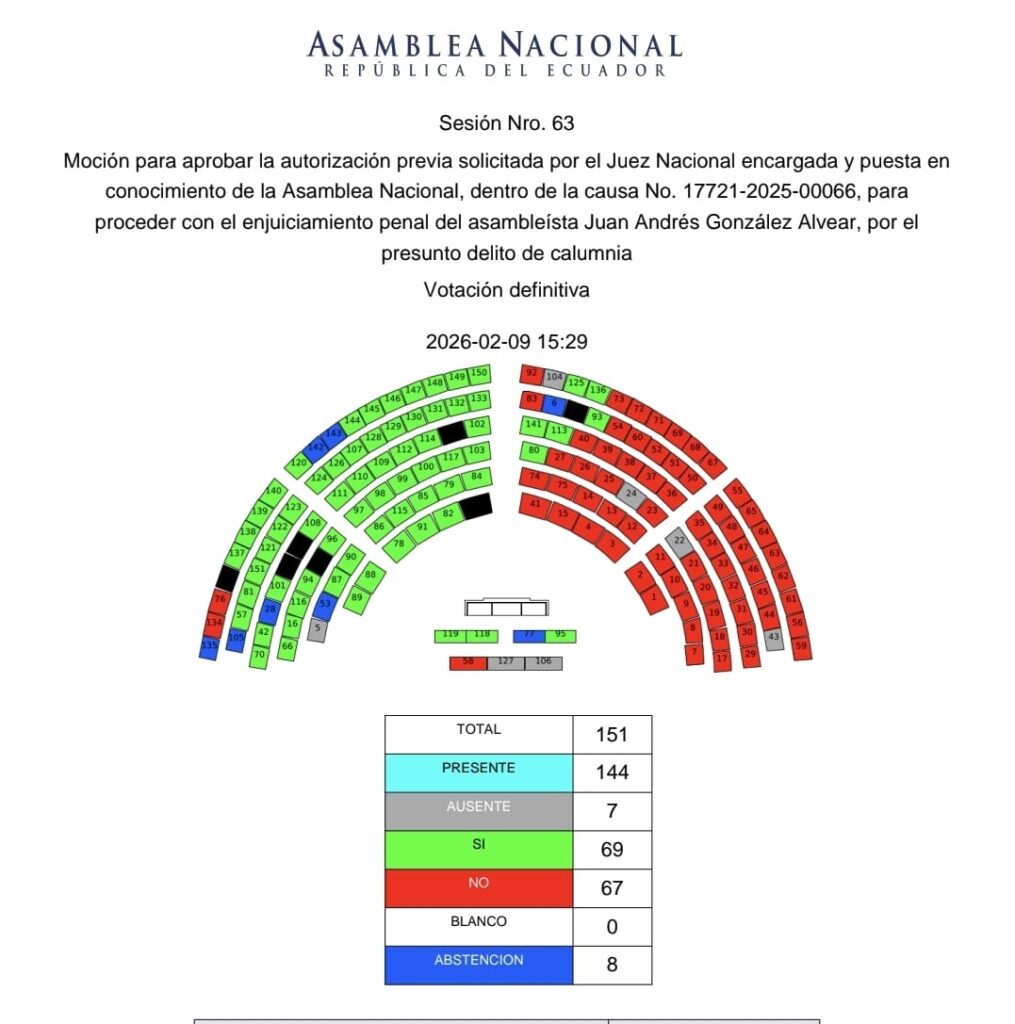 Además de la acción presentada por Mancheno, otros legisladores oficialistas habían presentado querellas contra González por declaraciones en las que calificó como “terroristas” a integrantes de la bancada gubernamental, acusaciones que motivaron el proceso judicial y la solicitud de levantamiento de inmunidad parlamentaria.