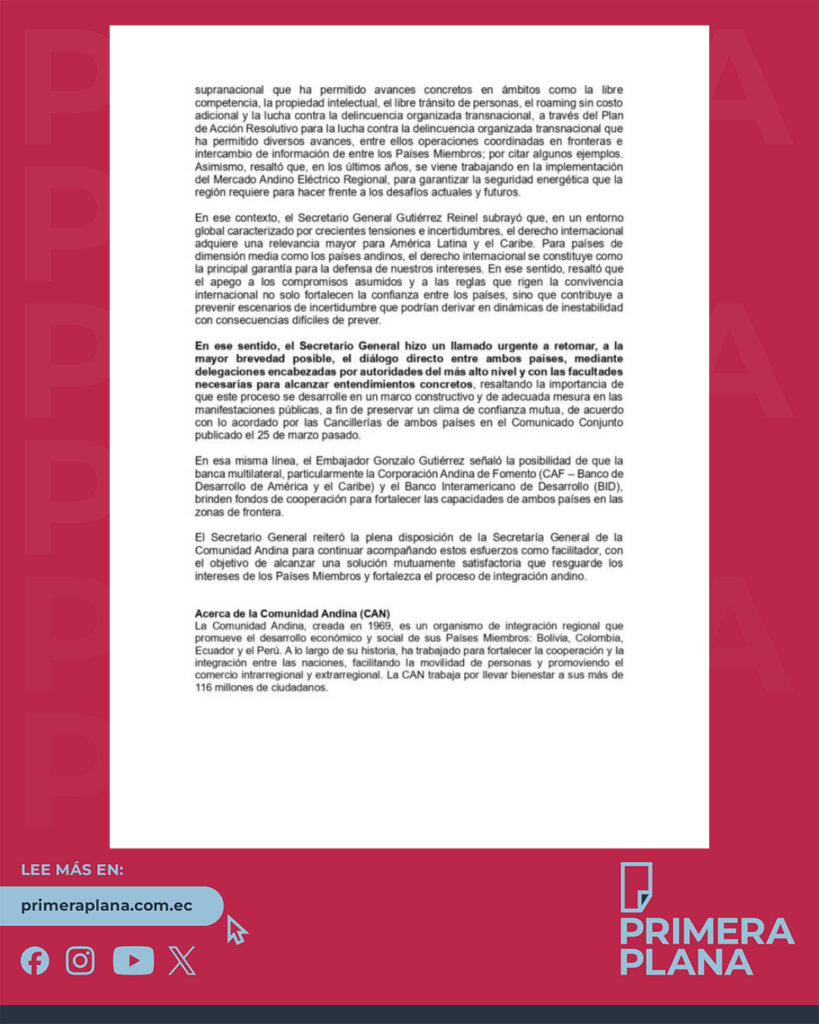 Finalmente, el organismo pidió mesura en las declaraciones públicas de ambos mandatarios. La Secretaría General de la CAN se ofreció oficialmente como facilitadora para alcanzar acuerdos concretos.