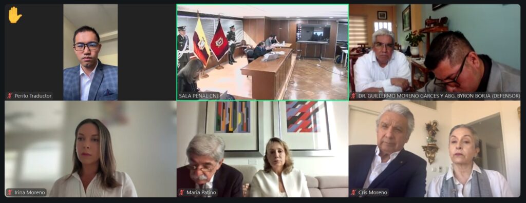 En este proceso están señalados el expresidente Lenín Moreno, su esposa Rocío González, su hija Irina, familiares, empresarios y exfuncionarios ecuatorianos y chinos. Todos son acusados por el presunto delito de cohecho. Moreno y su esposa comparecieron de manera telemática desde Paraguay.