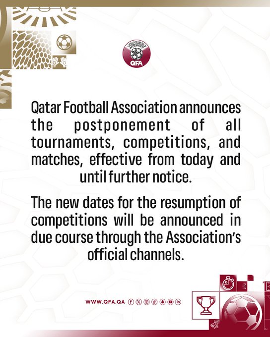 La Federación de Fútbol de Catar anunció este domingo, 1 de marzo, la suspensión de todas las competiciones deportivas en su territorio, en medio de la creciente inestabilidad en Medio Oriente tras los recientes ataques de Israel contra Irán.