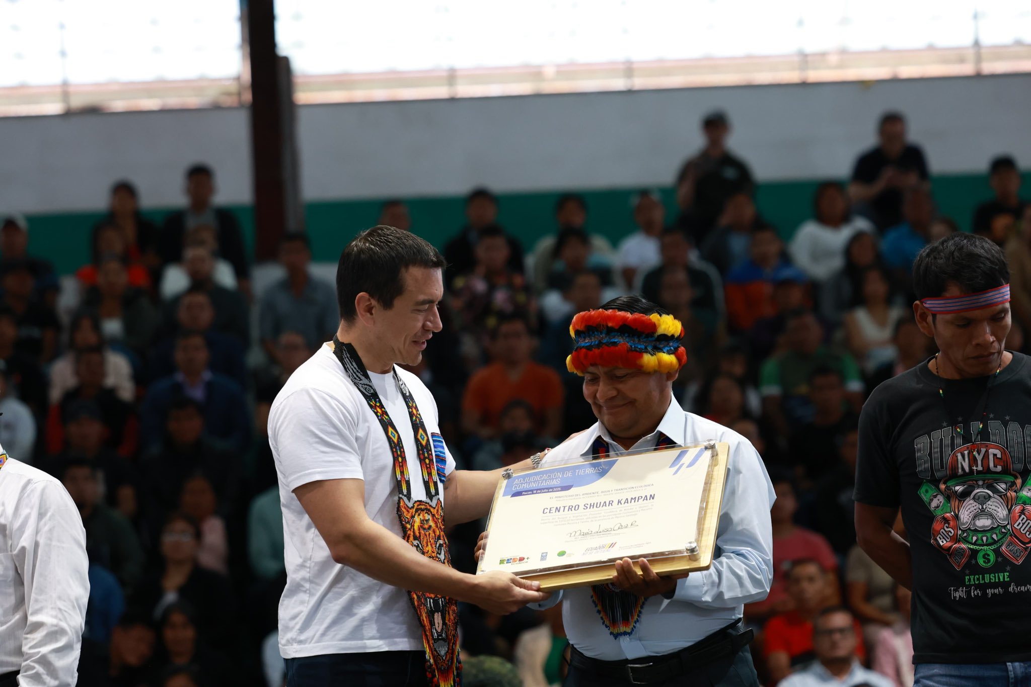 PORTADA Noboa entrega títulos de propiedad a comunidades shuar en la... El presidente Daniel Noboa entregó este viernes títulos de propiedad comunitaria a cinco centros shuar en la Amazonía, en atención...
