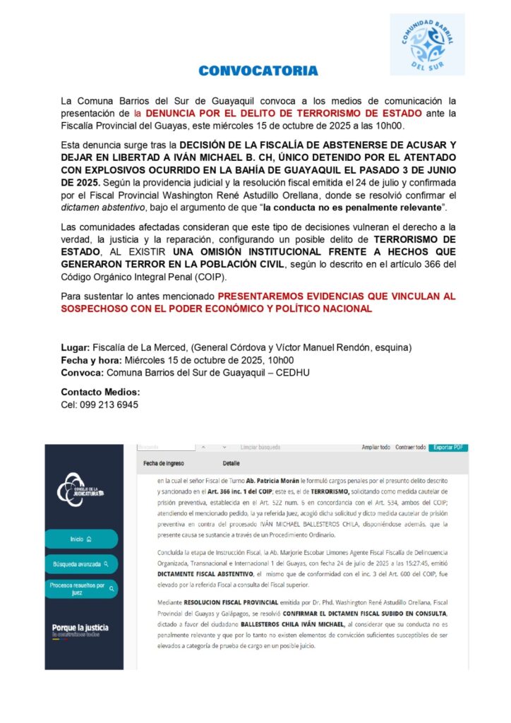 La Comuna Barrios del Sur de #Guayaquil anunció que este miércoles, 15 de octubre, presentará una denuncia ante la Fiscalía Provincial del Guayas por el presunto delito de “terrorismo de Estado”. En un comunicado, la Comuna argumentó que la acción judicial se fundamenta en la decisión de la Fiscalía de abstenerse de acusar y dejar en libertad a Iván Michael Ballesteros Chila, el único detenido por el atentado con explosivos registrado el 3 de junio de 2025 en el sector de La Bahía.