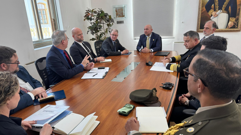 Loffredo, junto al viceministro, Roberto Quintero, y el jefe del Comando Conjunto de las Fuerzas Armadas Accidental, Pablo Caicedo, recibió a la delegación en una cita en la que se identificaron y priorizaron las necesidades estratégicas del país en temas de seguridad.