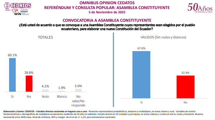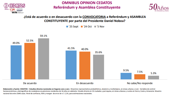La consulta popular y el referéndum convocados por el presidente Daniel Noboa cuentan con un nivel significativo de apoyo ciudadano, de acuerdo con un estudio nacional realizado por CEDATOS. El sondeo, actualizado al 5 de noviembre, mostró que el 59,1% de los encuestados se muestra de acuerdo con la convocatoria a referéndum y Asamblea Constituyente, frente a un 35,6% que se declara en desacuerdo. El 5,3% no respondió o no tiene una postura definida.