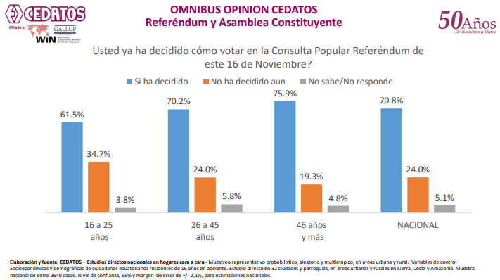 El estudio indicó que la mayoría de la población conoce la convocatoria y afirmó haber decidido ya su voto. El 75,9% de personas mayores de 46 años manifiestaron tener su decisión tomada, mientras que entre jóvenes de 16 a 25 años el nivel de definición baja a 61,5%.