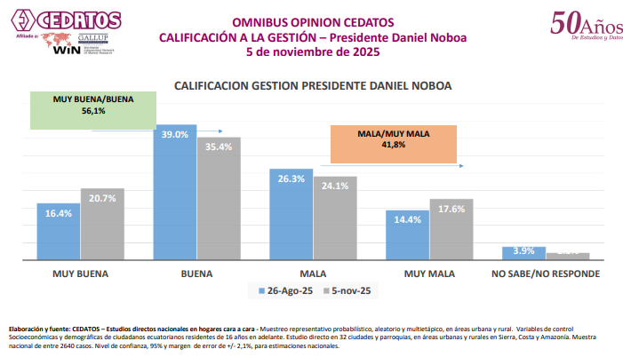 En cuanto al desempeño del presidente Noboa, el 56,1% calificó su gestión como muy buena o buena, frente al 41,8% que la considera mala o muy mala. En términos de credibilidad, el 51,9% señaló que cree en la palabra del presidente.
