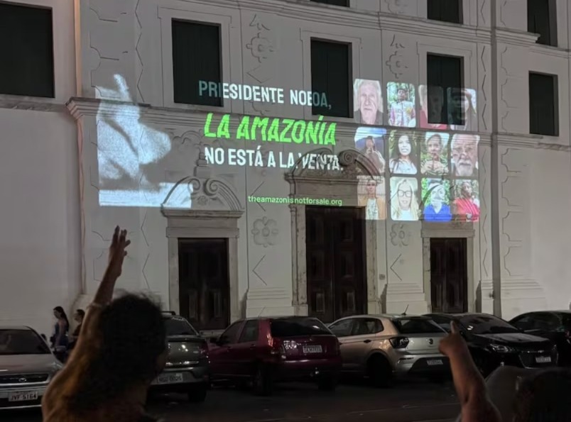 La noche del jueves 20 de noviembre, cuatro edificios emblemáticos de Belém, ciudad anfitriona de la COP30, se iluminaron con el mensaje “Noboa, la Amazonía no está en venta”, una intervención visual impulsada por organizaciones ambientales e indígenas. La acción buscó advertir sobre los riesgos que, según estas agrupaciones, implica la agenda petrolera del Gobierno del presidente Daniel Noboa.