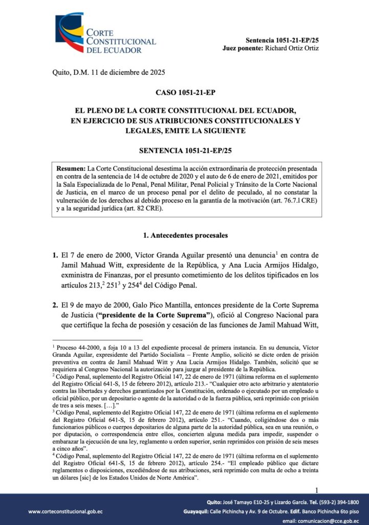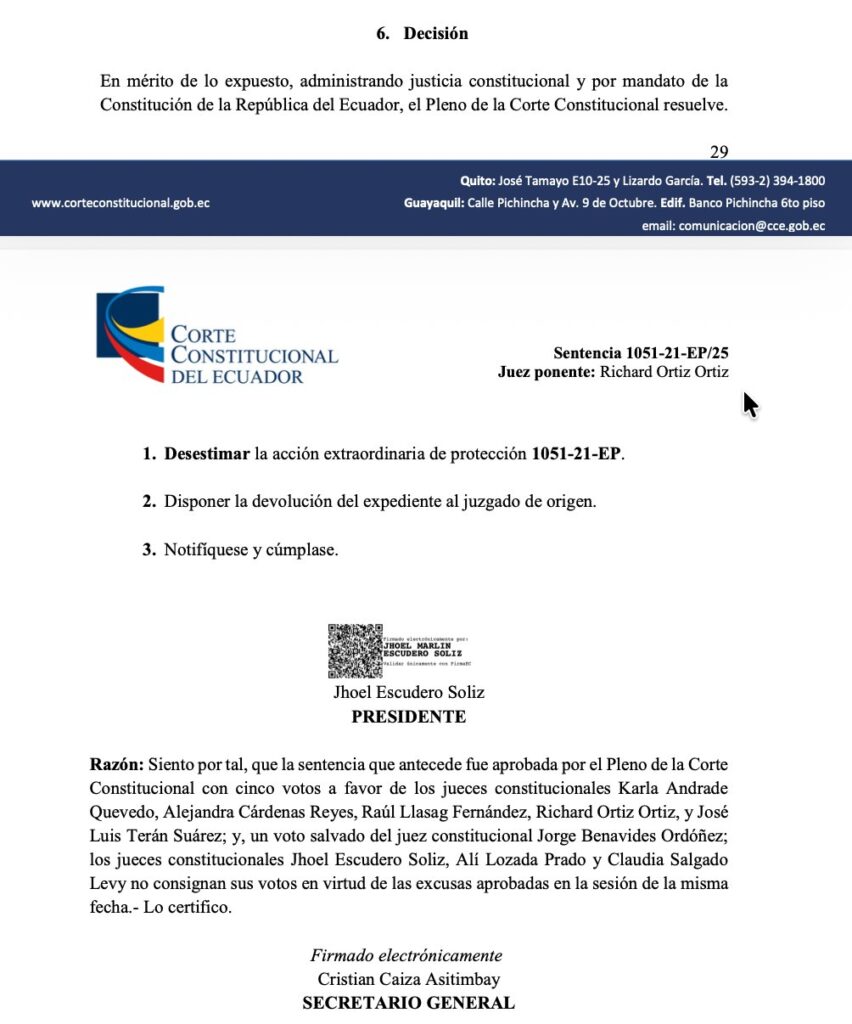 La decisión consta en la sentencia 1051-21-EP/25, aprobada por el Pleno del organismo el 11 de diciembre de 2025. El fallo contó con el voto favorable de cinco jueces constitucionales, un voto salvado y tres excusas, según el acta oficial.