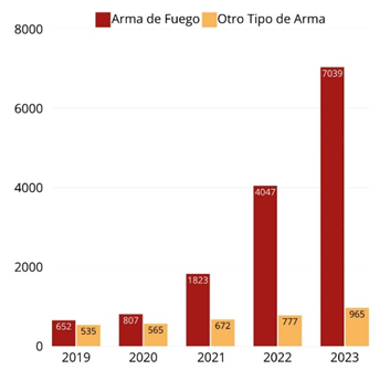 Estas cifras superan la media regional y mundial de violencia cometida con estos dispositivos. Si bien las muertes violentas corresponden a hombres jóvenes, los asesinatos de mujeres también presentan un crecimiento significativo en los últimos años. “En el caso de los femicidios registrados en 2023, las muertes violentas de mujeres por razones de género sumaron un total de 321, de las cuales el 37 % fueron cometidas con arma de fuego”.