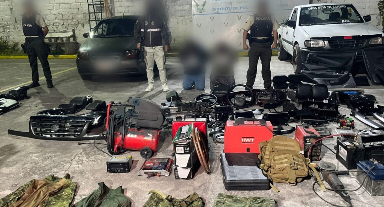 Entre las evidencias encontradas constan tapas, lunas, airbags, tacómetros, módulos de control y otros accesorios automotrices. Además, se incautaron teléfonos celulares, herramientas, equipos electrónicos y prendas con diseño tipo militar.