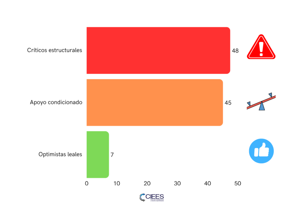 No se observa una polarización ideológica clásica, sino una volatilidad condicionada por resultados. La aprobación sube o baja en función del clima general del país, especialmente de la economía y la seguridad.