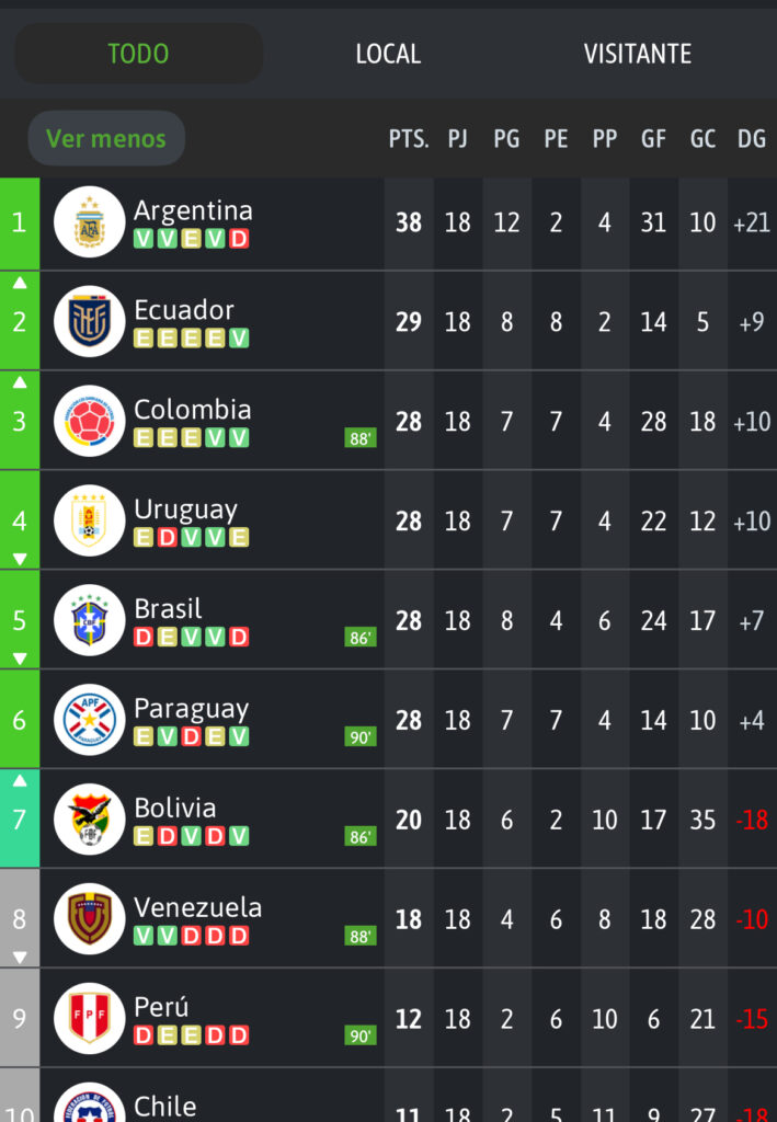 Con este triunfo, Ecuador cierra las eliminatorias en la segunda posición con 29 unidades, producto de 8 triunfos, 7 empates y apenas 2 derrotas, siendo la selección que menos derrotada en este proceso clasificatorio. Argentina mantiene el liderato de la tabla sudamericana con 37 puntos, gracias a una campaña de 12 victorias, 1 empate y 4 derrotas.