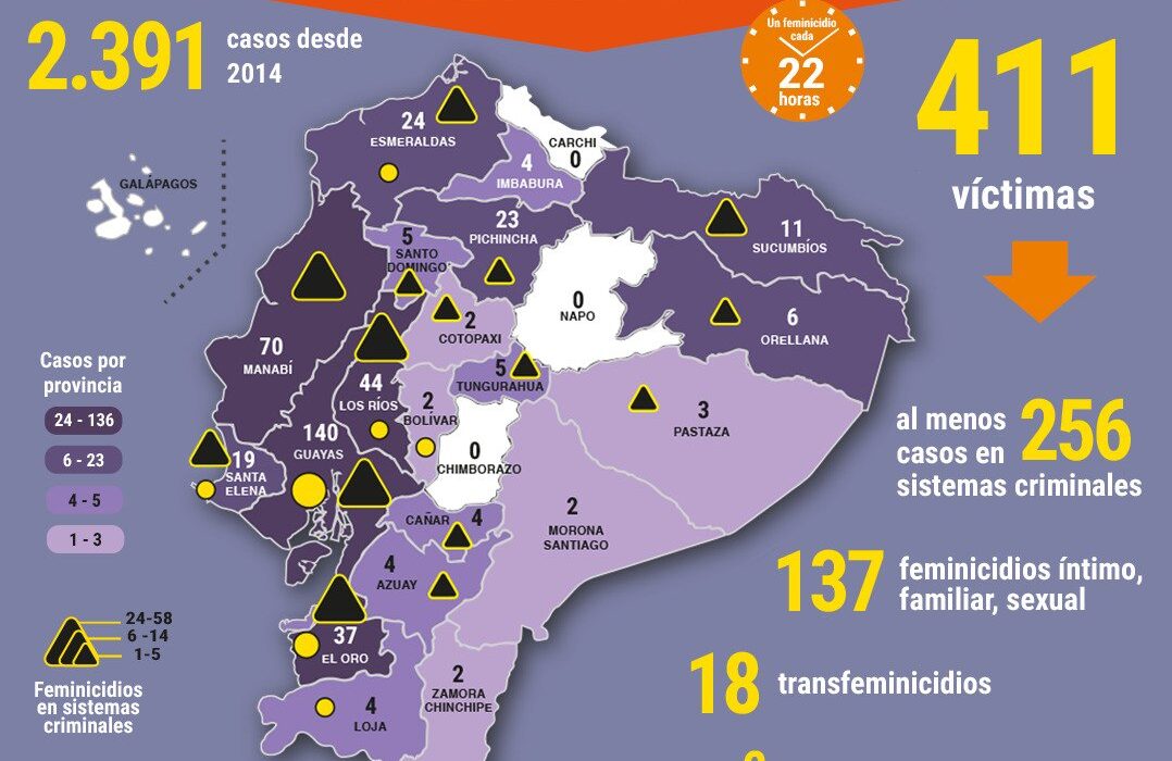 Ecuador contabiliza 411 víctimas de femicidio durante 2025, entre el 1 de enero y el 31 de diciembre, lo que equivale a un crimen cada 22 horas, según el mapeo nacional presentado por organizaciones feministas.