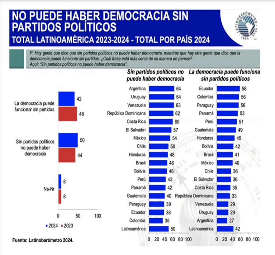 Como lo muestra el gráfico anterior, Ecuador es el país que lidera la tabla en el sentido de que la ciudadanía piensa que la democracia puede funcionar sin partidos políticos, lo que sustenta plenamente tanto la suspensión del financiamiento público de las organizaciones políticas como la pregunta sobre la reducción de asambleístas que impulsa el gobierno.