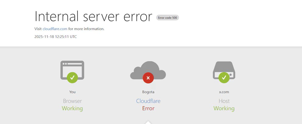 Los primeros reportes surgieron cuando usuarios señalaron que X (antes Twitter) había dejado de cargar publicaciones, especialmente en su versión web. A partir de allí, el problema se expandió rápidamente a otras aplicaciones que dependen del sistema de distribución de Cloudflare.