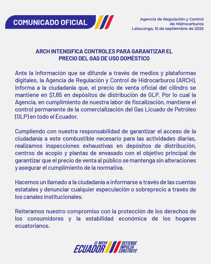 La Agencia de Regulación y Control de Hidrocarburos (ARCH) informó que desplegará controles permanentes en los depósitos de distribución, centros de acopio y plantas de envasado, con el fin de constatar que el precio oficial se respete en todo el país.