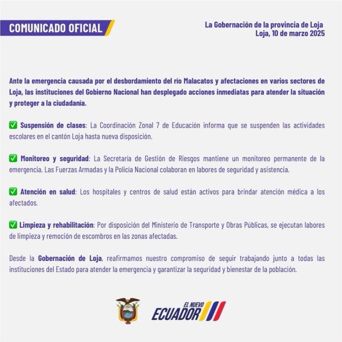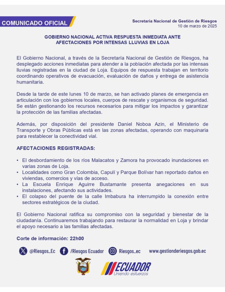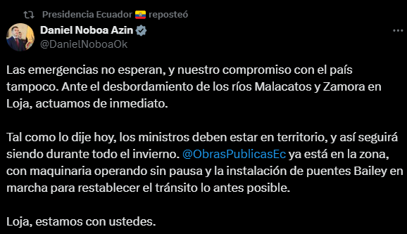 “Las emergencias no esperan, y nuestro compromiso con el país tampoco. Ante el desbordamiento de los ríos Malacatos y Zamora en Loja, actuamos de inmediato”, escribió el mandatario en su cuenta en X.