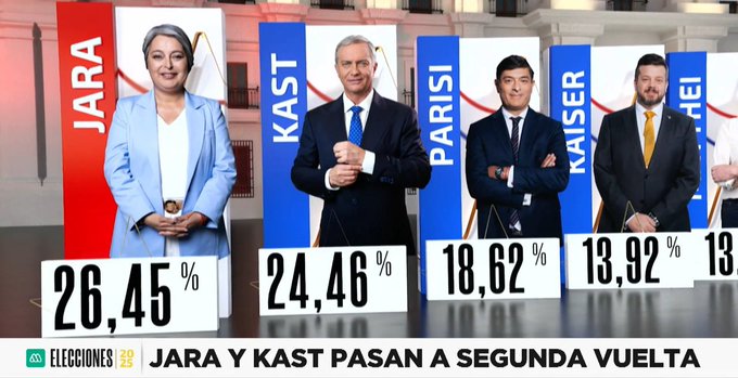 Los resultados preliminares entregados por el Servicio Electoral asignan a Jara un 26,45% de los votos, mientras que Kast se ubica en segundo lugar con 24,46%. En tercera posición aparece el candidato populista Franco Parisi, quien obtiene un 18,62% y se consolida como una de las fuerzas emergentes del proceso.