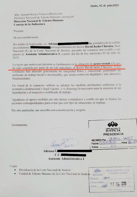 Una denuncia de presunto acoso sexual contra el juez de la Corte Nacional de Justicia, David Jacho Chicaiza, pone en el centro del debate la integridad del sistema judicial en Ecuador. La víctima, una asistente de despacho, decidió renunciar a su cargo el pasado 2 de julio de 2025, alegando que las conductas del magistrado afectaron su bienestar emocional, su dignidad y sus derechos fundamentales.