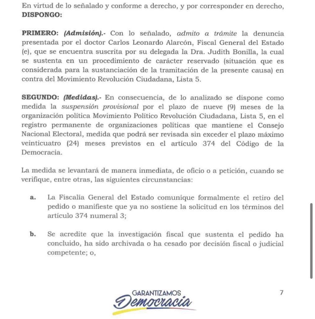 El juez del Tribunal Contencioso Electoral (TCE), Joaquín Viteri, dispuso la suspensión provisional por nueve meses del movimiento Revolución Ciudadana (RC), lista 5, del registro permanente de organizaciones políticas del Consejo Nacional Electoral (CNE).