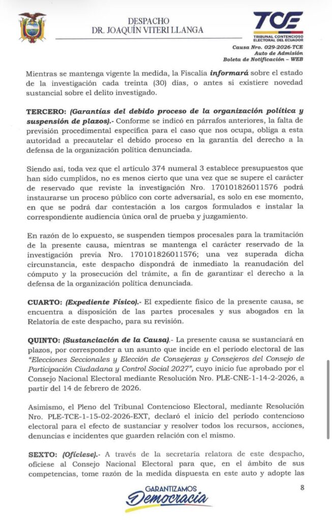 Por ello, mientras se mantenga esa reserva, los plazos procesales del trámite quedarán suspendidos, con el fin de garantizar el derecho a la defensa de la organización política denunciada.