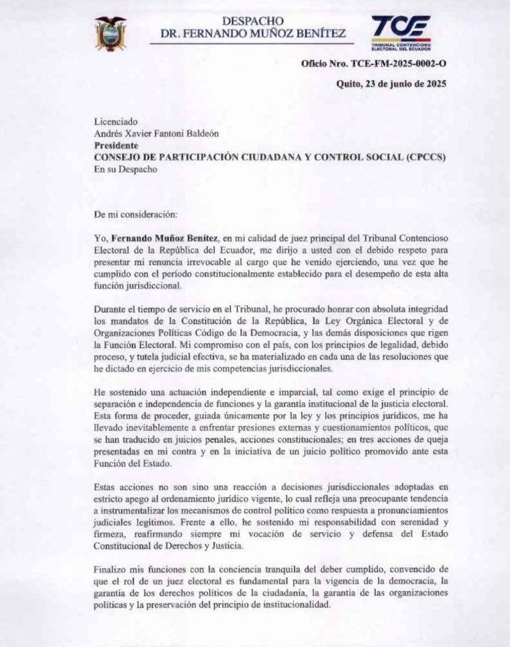 Fernando Muñoz presentó su renuncia “irrevocable” al cargo de juez principal del Tribunal Contencioso Electoral (TCE) de Ecuador, alegando que ha cumplido con el período constitucionalmente establecido para el desempeño de esta alta función jurisdiccional.