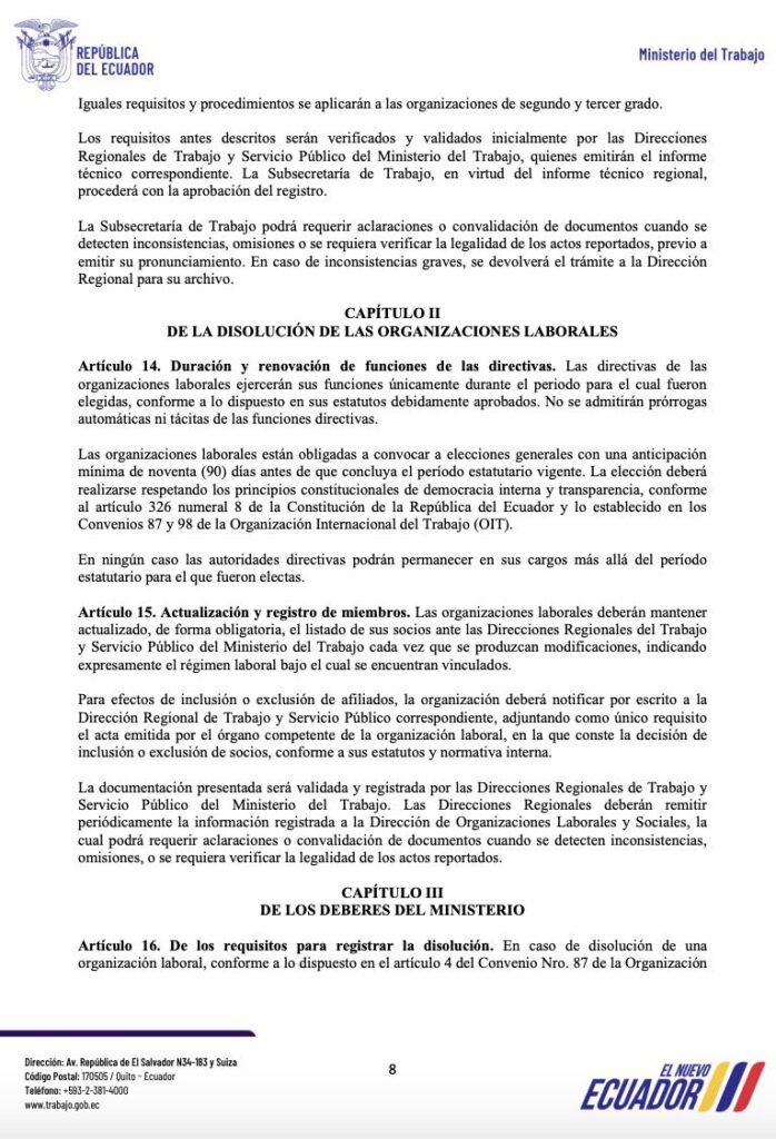 Con este reglamento, el Gobierno busca promover mayor transparencia, participación equitativa y renovación dentro del movimiento sindical ecuatoriano.
