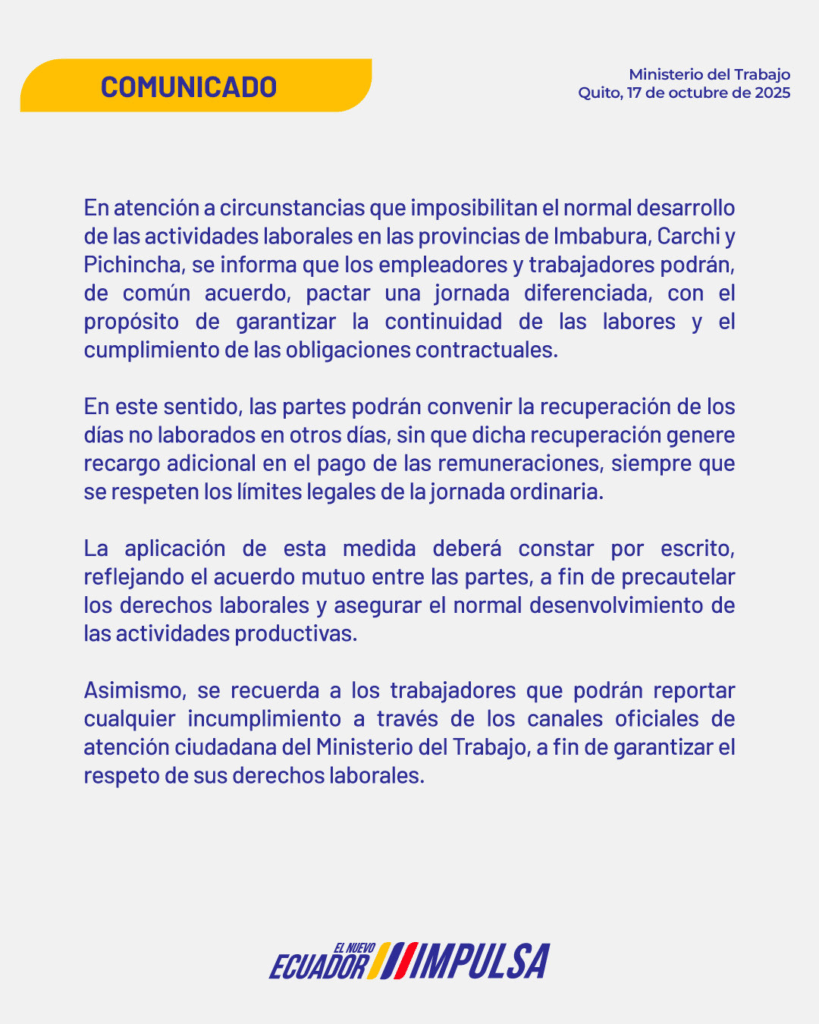 El Ministerio de Trabajo emitió el viernes, 17 de octubre, una disposición dirigida a empleadores y trabajadores de Imbabura, Carchi y Pichincha, provincias afectadas por los bloqueos de carreteras que cumplen ya 26 días. La medida busca facilitar la continuidad de las actividades laborales en medio de las protestas del movimiento indígena.
