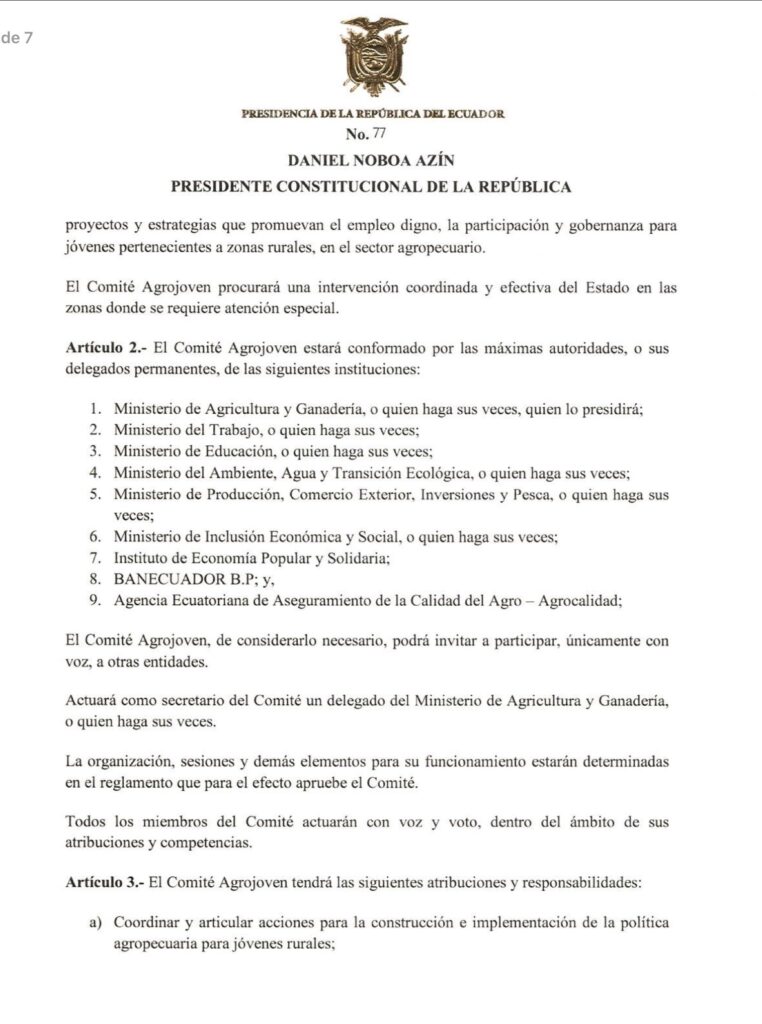 El presidente Daniel Noboa firmó el Decreto Ejecutivo Nº 77, que crea el Comité Agrojoven. Se trata de una instancia, que según el decreto, sirve para promover el empleo digno y la participación de los jóvenes en el sector agropecuario rural.