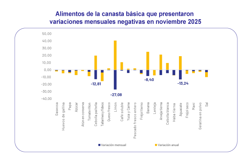 - Alimentos y bebidas no alcohólicas: varios productos básicos registraron disminuciones importantes, entre ellos el limón (-27,08%), la cebolla paiteña (-12,81%), la zanahoria (-18,33%) y la papa (-3,15%).