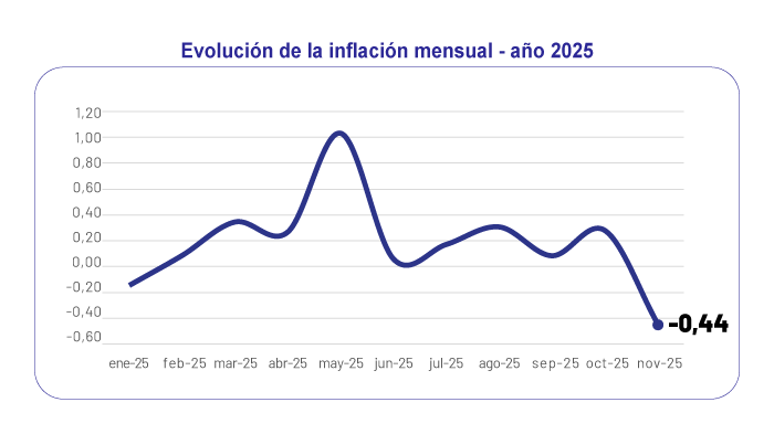 La inflación mensual de noviembre de 2025 fue de -0,44%, según los datos oficiales difundidos este lunes por el Ministerio de Economía y Finanzas. Para la cartera de Estado, esta es una “reducción significativa que se traduce en un alivio directo para los bolsillos de las familias ecuatorianas”.
