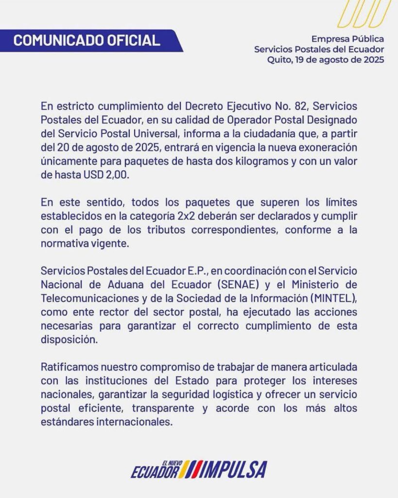 A través de un comunicado, la Empresa Pública de Servicios Postales del Ecuador informó que desde este miércoles, 20 de agosto, entra en vigencia la nueva exoneración 2×2, para paquetes cuyo peso no supere los dos kilogramos y cuyo valor sea de hasta USD 2.