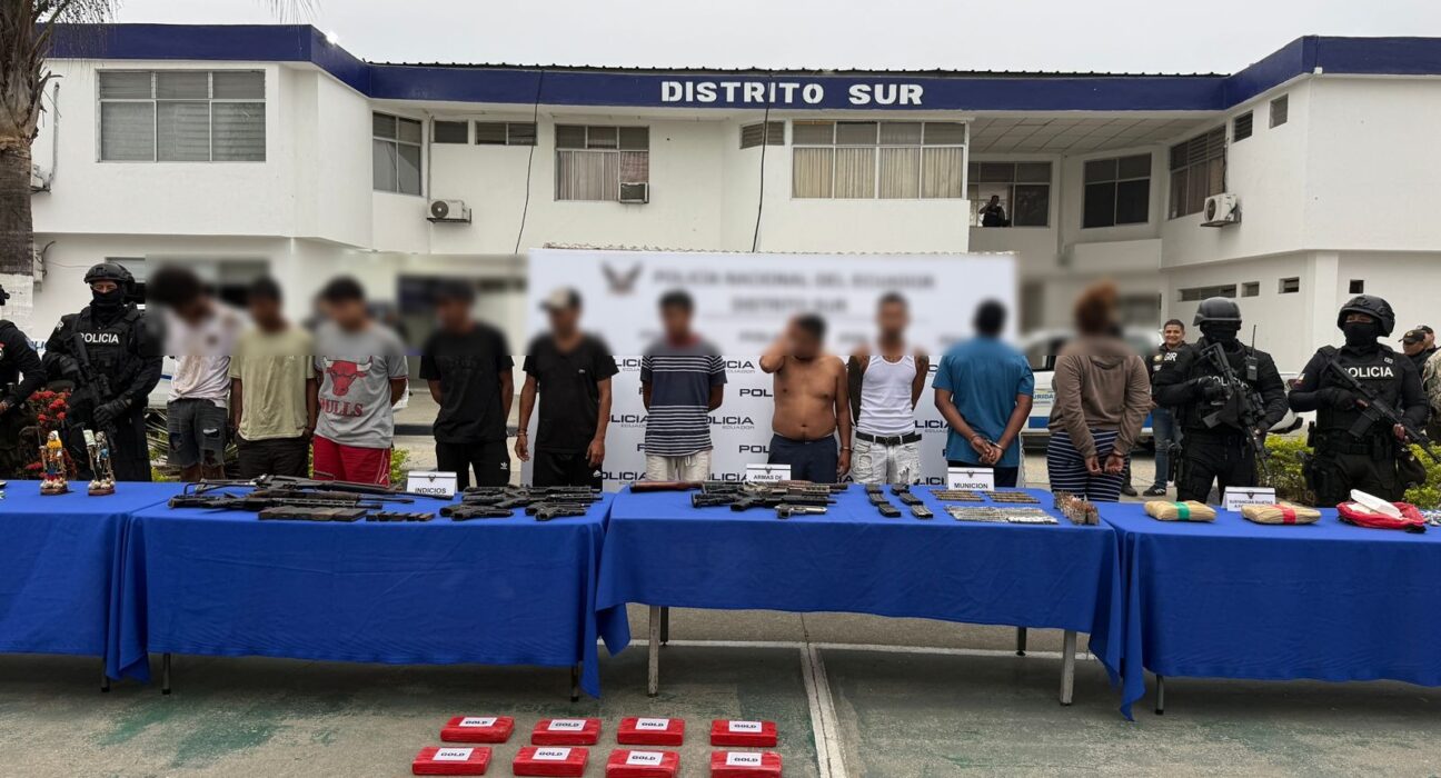 Las unidades policiales decomisaron siete fusiles, cinco pistolas, 24 alimentadoras y más de 2.700 cartuchos, junto con varios bloques de droga incautados en distintos puntos, uno de ellos en el sector de Tarifa, con apoyo de la Armada del Ecuador.