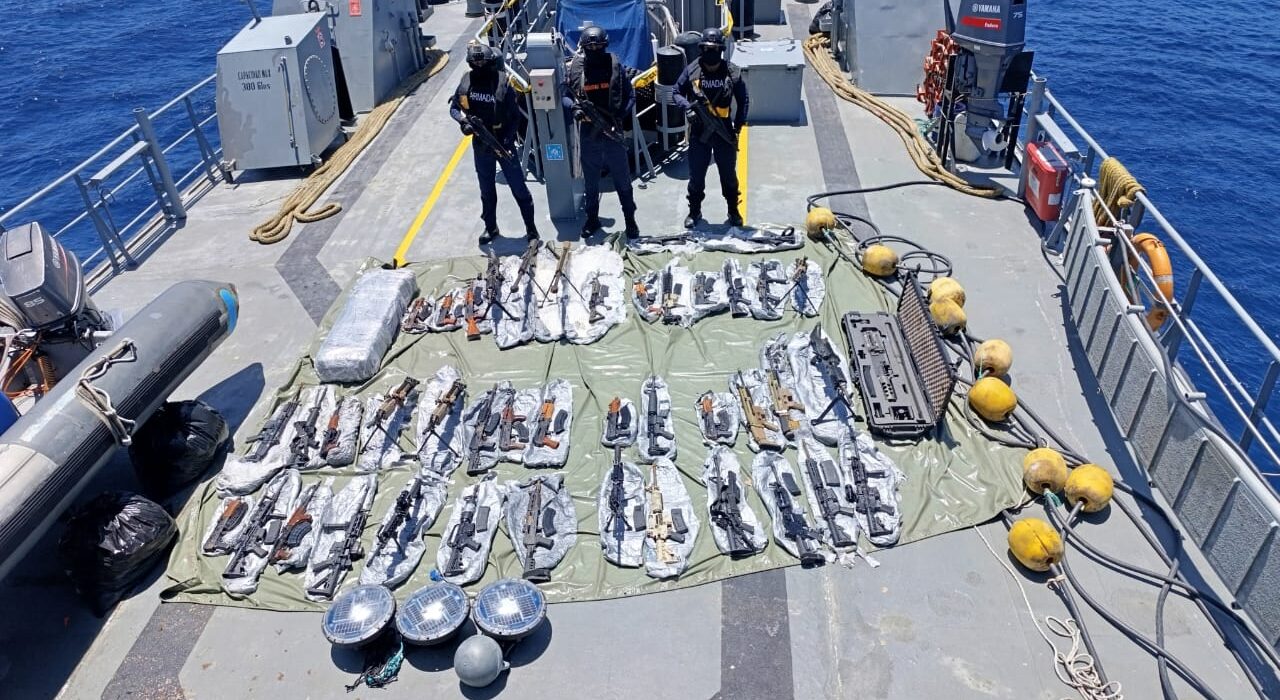 El Comando Conjunto de las Fuerzas Armadas (FF.AA.) detalló en un comunicado que durante la acción de control y vigilancia marítima, la Armada del Ecuador localizó ocho bultos con armamento en el mar. Las unidades guardacostas procedieron a su recuperación e iniciaron una operación de interdicción en el área.