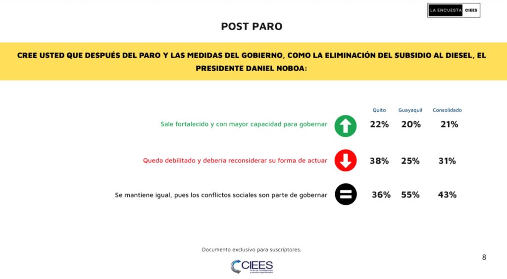 Consultados sobre el impacto del reciente paro nacional y las medidas económicas del Ejecutivo —como la eliminación del subsidio al diésel—, el 43% considera que el presidente “se mantiene igual, pues los conflictos sociales son parte de gobernar”. Un 31% cree que queda debilitado, mientras que un 21% opina que sale.