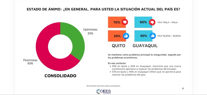El pesimismo es mayor en la capital, donde siete de cada diez quiteños (70%) califican la situación actual del país como mala o muy mala, frente a un 60% en Guayaquil.