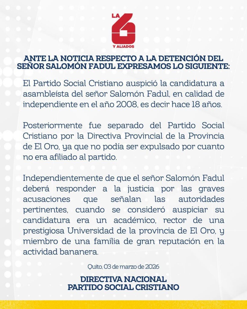 El Partido Social Cristiano (PSC) emitió un pronunciamiento este martes, 3 de marzo, tras la detención de Salomón Fadul, exasambleísta vinculado a una estructura criminal que operaba con la mafia albanesa para el envío de droga a Europa.