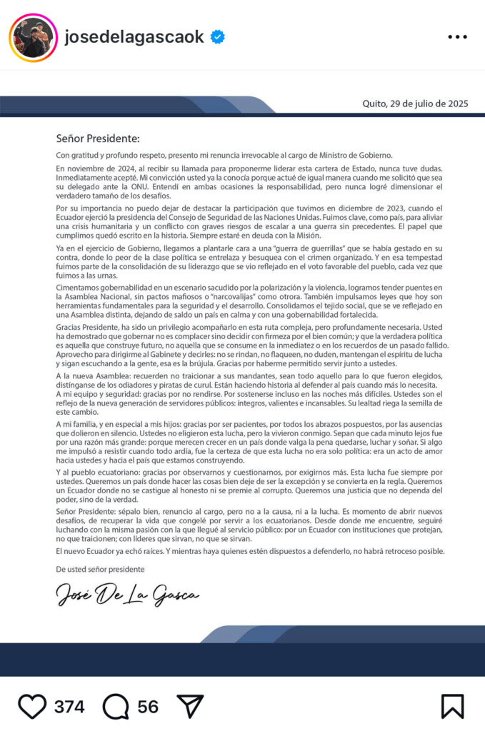 José De La Gasca presentó su renuncia irrevocable, al cargo de Ministro de Gobierno. Lo hizo en una carta que se conoció la tarde este martes y que está dirigida al presidente de la República, Daniel Noboa Azín.