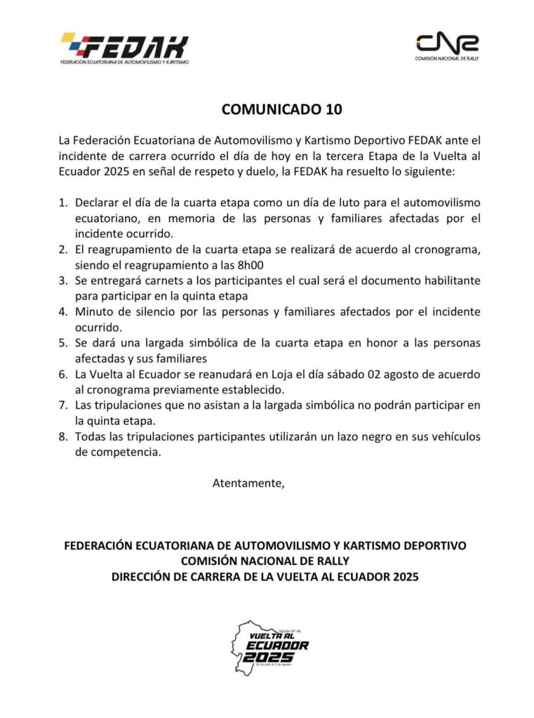 Luego del trágico siniestro ocurrido durante la tercera etapa de la Vuelta al Ecuador 2025, la Federación Ecuatoriana de Automovilismo y Kartismo (Fedak) suspendió la cuarta etapa y declaró este jueves como “día de luto”. La competencia se reanudará el sábado, 2 de agosto, en Loja, conforme al cronograma original.