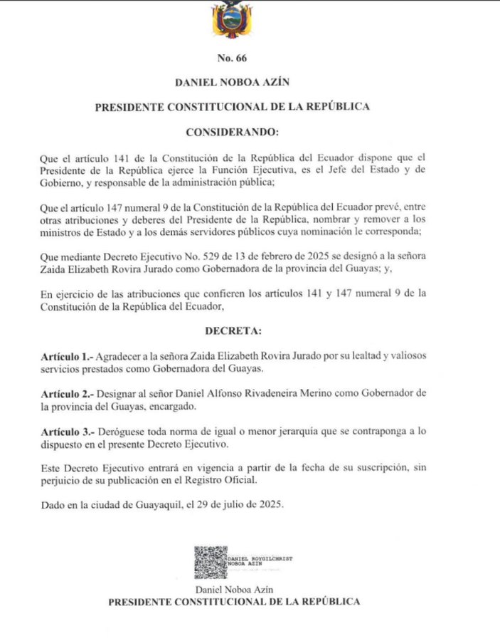 A la par, mediante el Decreto Ejecutivo 66, el mandatario designó a Daniel Alfonso Rivadeneira Merino como gobernador encargado de la provincia de Guayas. Rivadeneira se desempeñaba como intendente general de Policía del Guayas desde el 23 de abril de 2025.
